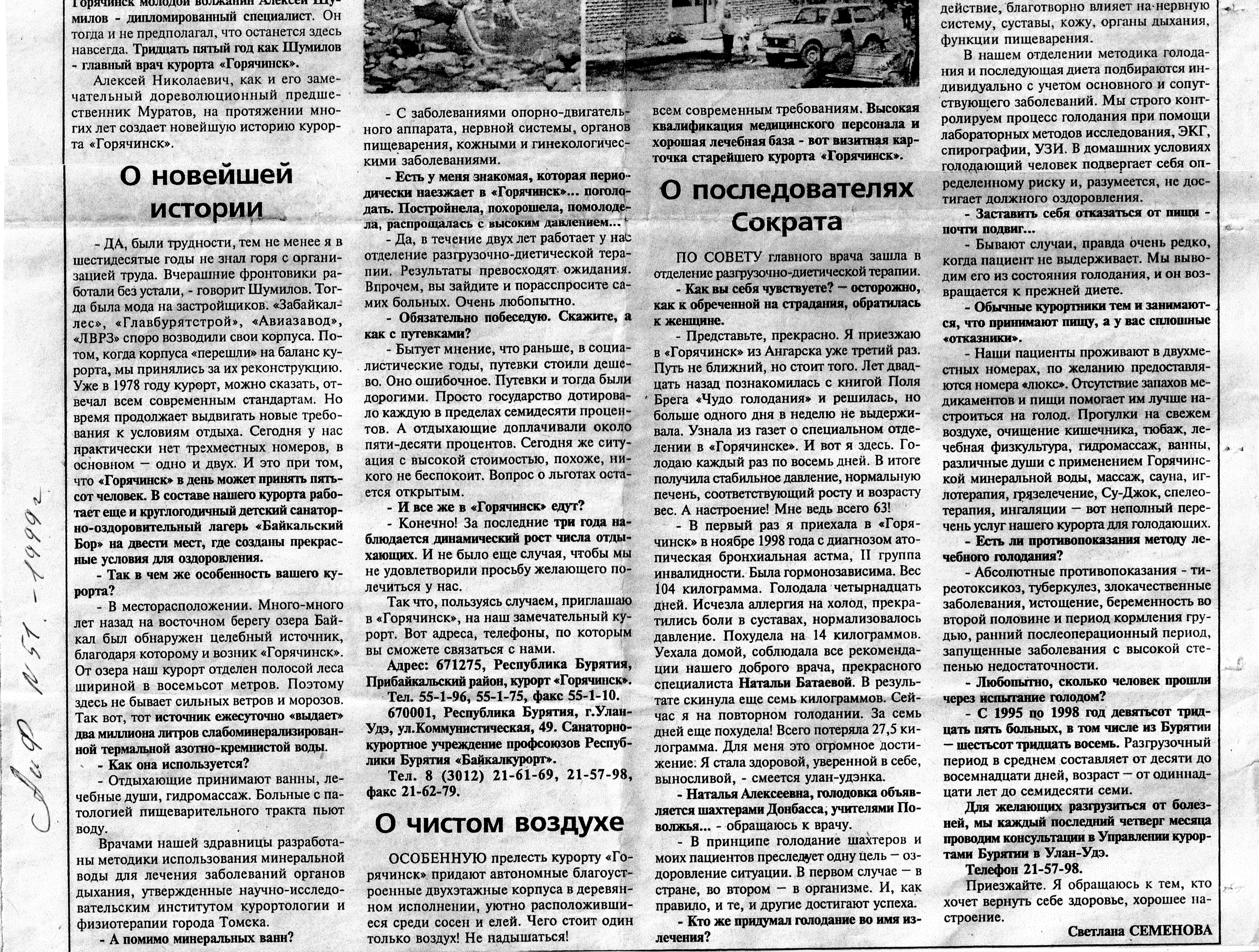 - Конечно! За последние три года наблюдается динамический рост числа отдыхающих. И не было еще случая, чтобы мы не удовлетворили просьбу желающего полечиться у нас. Так, что, пользуясь случаем, приглашаю в «Горячинск», на наш замечательный курорт.
