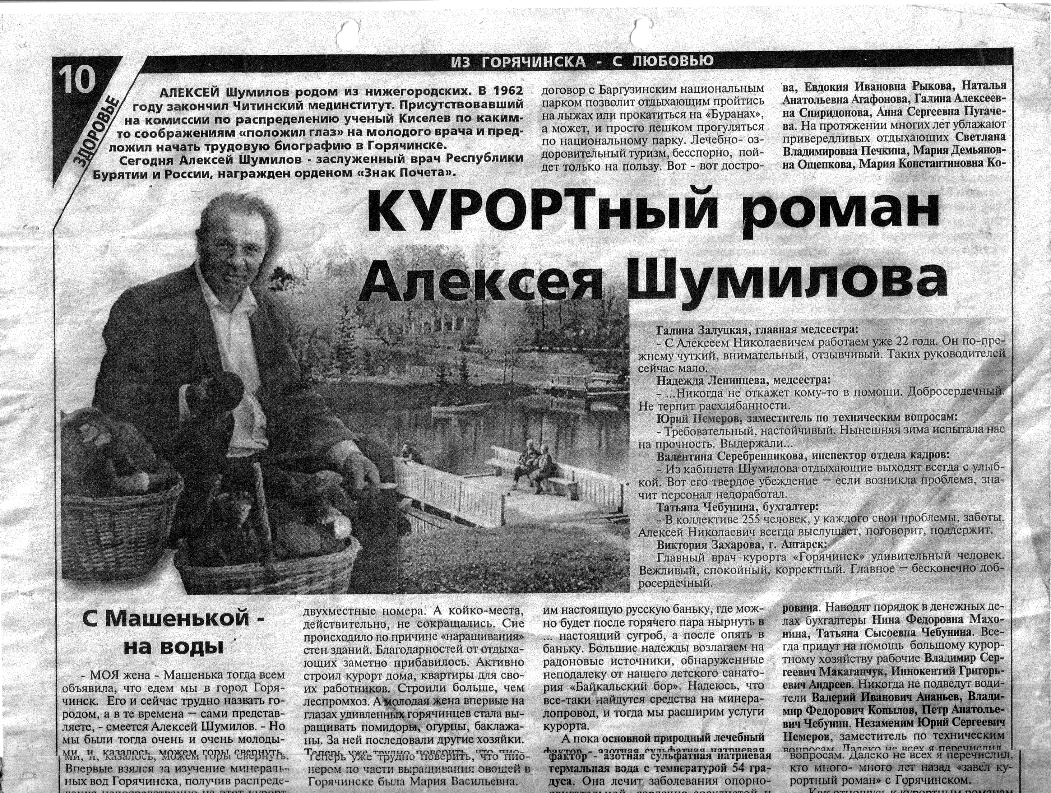 - РАЗУМЕЕТСЯ, ничего бы не достиг без родного коллектива. Со многими из них я шагаю с первого дня моего приезда в Горячинск. Все, к сожалению, проходит, как один день…Настолько жизнь быстротечна. Премного благодарен своим коллегам за их труд. Кажется, совсем недавно принимал на работу Надежду Ленинцеву. Она здесь нашла свою любовь- Альберта Сергеевича, талантливого гинеколога, которому, кстати, многие женщины писали, что после долгих лет болезни, после его лечения удалось забеременеть и родить. Помню, совсем девчонками приехали две симпатичные сестрички Соколовы, закончившие с отличием Улан-Удэнское медучилище. До сих пор они, так же как и Ленинцевы, работают на курорте и говорят, что ни за что не променяют Горячинск на другие города. Видимо, это и есть Судьба. И таких верных своему делу работников у нас немало. Это Наталья Васильевна Леонова, лаборант-клиницист, Наталья Алексеевна Батаева-Крупская, врач-терапевт, супруги Кузнецовы, медсестры- Татьяна Николаевна Тюрюханова, Людмила Алексеевна Карчевская, Антонина Иосифовна Панова, Екатерина Аркадьевна Литвинцева, Евдокия Ивановна Рыкова, Наталья Анатольевна Агафонова, Галина Алексеевна Спиридонова, Анна Сергеевна Пугачева. На протяжении многих лет ублажают привередливых отдыхающих Светлана Владимировна Печкина, Мария Демьяновна Ощепкова, Мария Константиновна Коровина. Наводят порядок в денежных делах бухгалтеры Нина Федоровна Махонина, Татьяна Сысоевна Чебунина. Всегда придут на помощь большому курортному хозяйству рабочие Владимир Сергеевич Макаганчук, Иннокентий Григорьевич Андреев. Никогда не подведут водители Валерий Иванович Ананьев, Владимир Федорович Копылов, Петр Анатольевич Чебунин. Незаменим Юрий Сергеевич Немеров, заместитель по техническим вопросам. Далеко не всех я перечислил, кто много-много лет назад «завел курортный роман» с Горячинском.