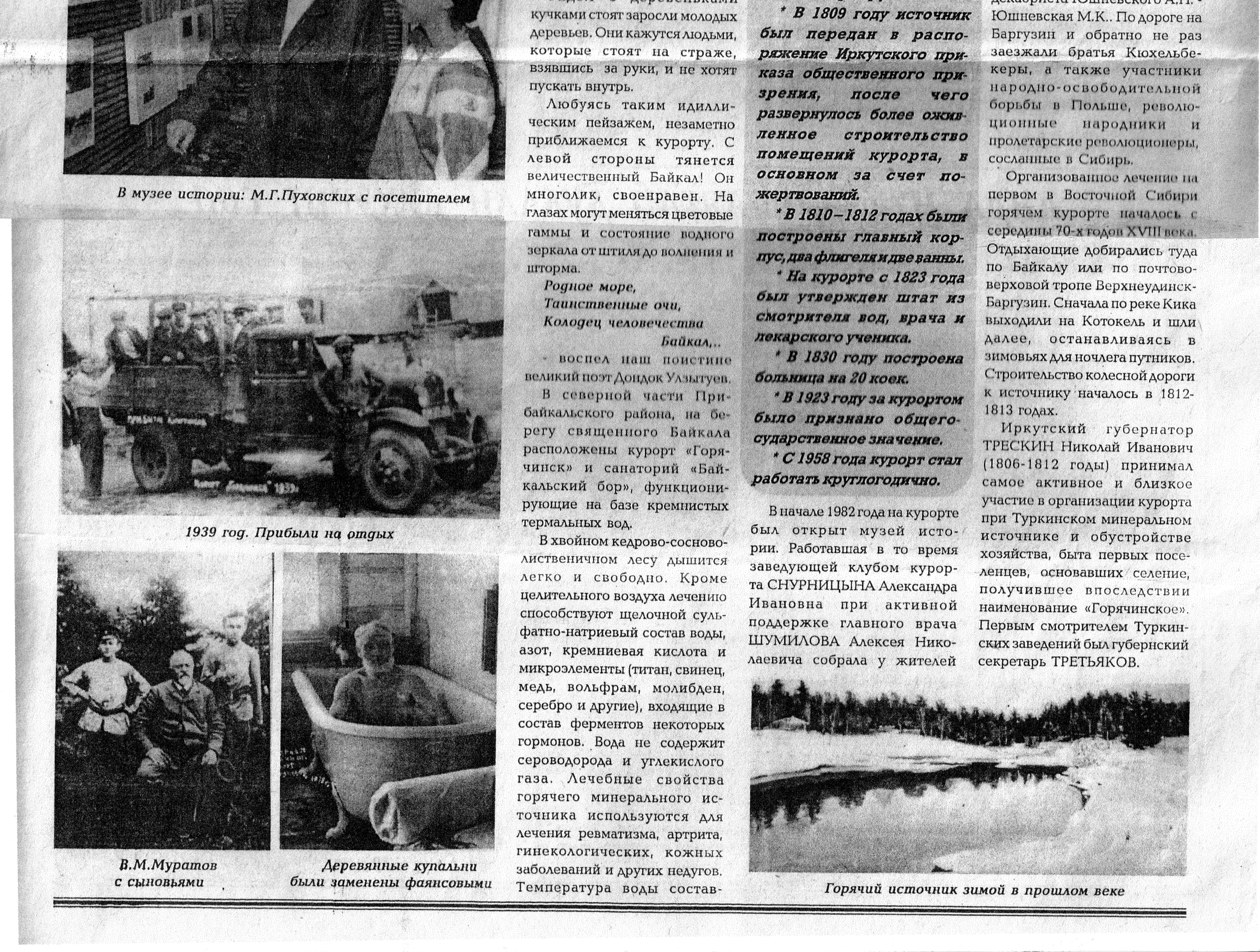 - Первые наблюдения за лечебным действием минеральной воды сделал в 1799 голу Иркутский штаб-лекарь Грунт.