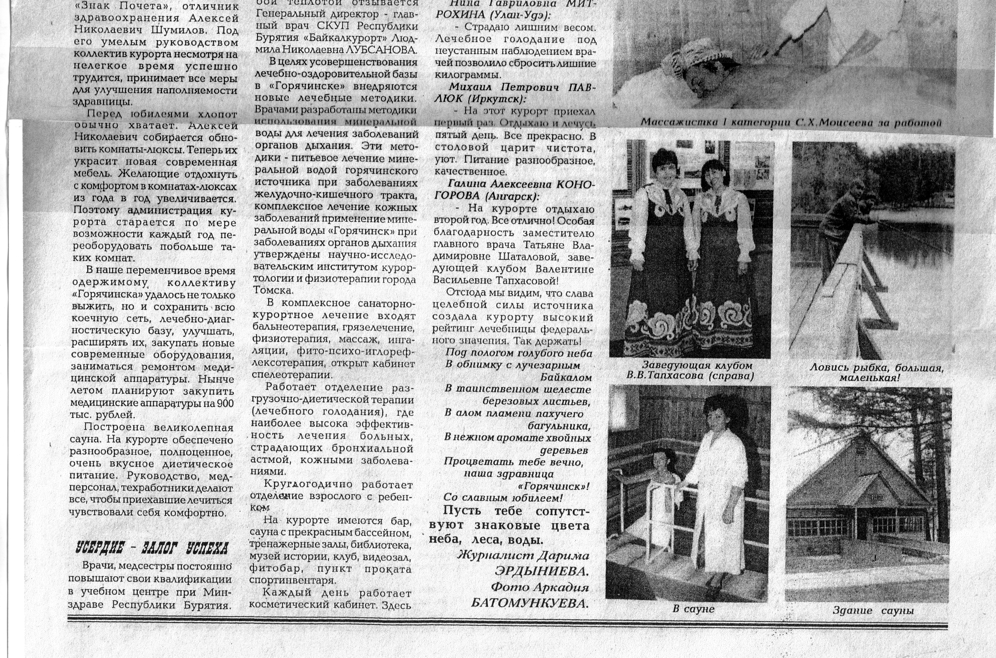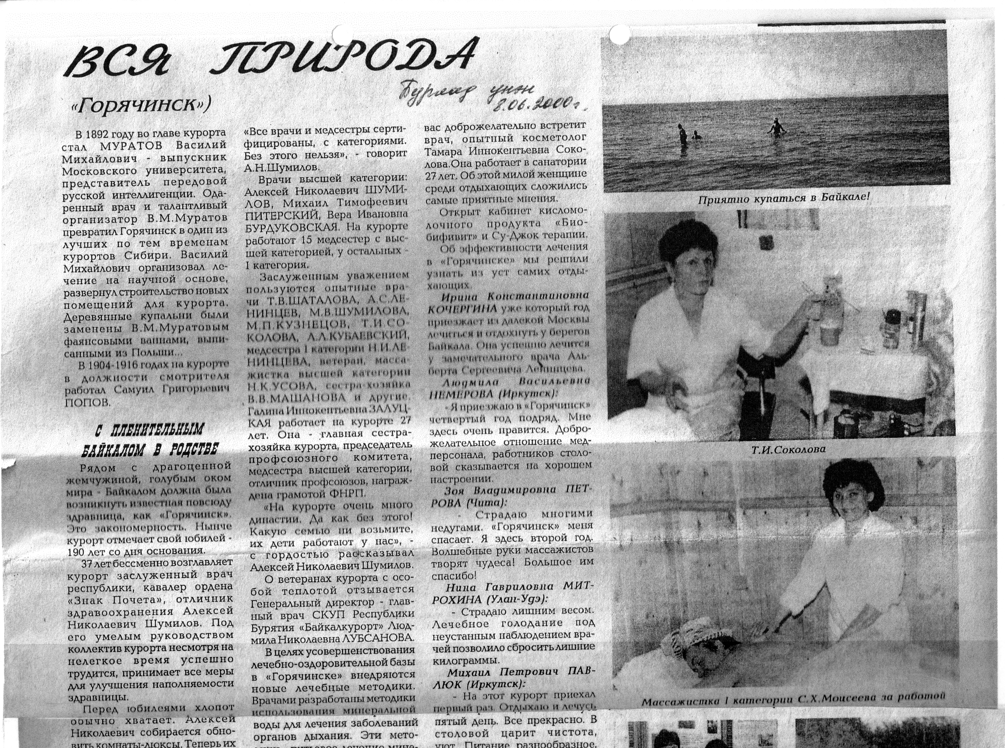 Ирина Константиновна КОЧЕРГИНА (уже который год приезжает из далёкой Москвы лечиться и отдохнуть у берегов Байкала). Она успешно лечится у замечательного врача — Альберта Сергеевича Ленинцева.