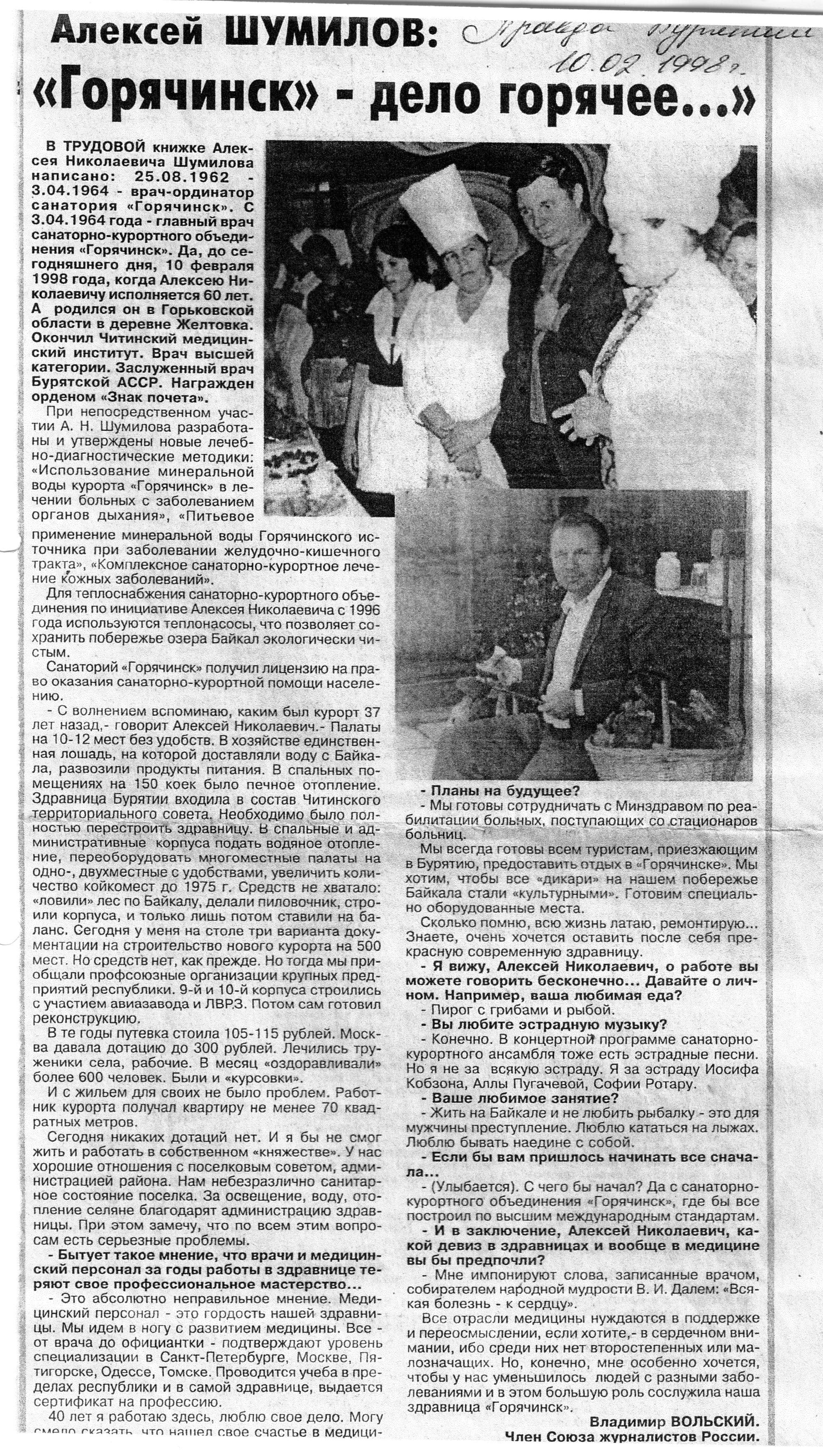 Да, до сегодняшнего дня, 10 февраля 1998 года, когда Алексею Николаевичу исполняется 60 лет. А родился в Горьковской области в деревне Желтовка. Окончил Читинский медицинский институт. Врач высшей категории. Заслуженный врач Бурятской АССР. Награжден орденом «Знак почета».