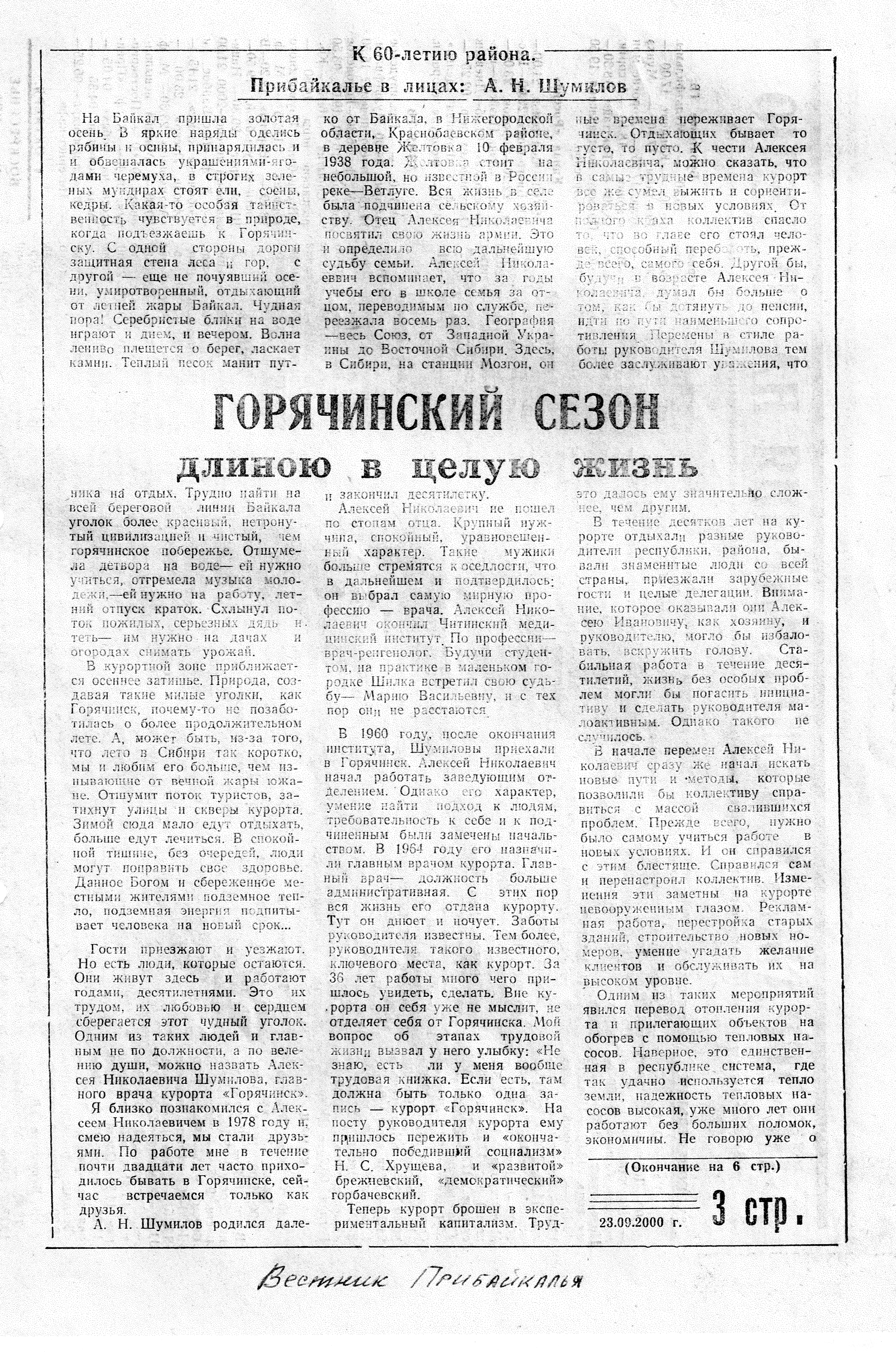 В 1960 году, после окончания института, Шумиловы приехали в Горячинск. Алексей Николаевич начал работать заведующим отделением. Однако его характер, умение найти подход к людям, требовательность к себе и к подчинённым были замечены начальством. В 1964 году его назначили главным врачом курорта. Главный врач — должность больше административная. С этих пор вся жизнь его отдана курорту. Тут он днюет и ночует. Заботы руководителя известны. Тем более, руководителя такого известного, ключевого места, как курорт. За 36 лет работы много чего пришлось увидеть, сделать. Вне курорта он себя уже не мыслит, не отделяет себя от Горячинска. Мой вопрос об этапах трудовой жизни вызвал у него улыбку: «Не знаю, есть ли у меня вообще трудовая книжка. Если есть, там должна быть только одна запись — курорт «Горячинск». На посту руководителя курорта ему пришлось пережить и «окончательно победивший социализм» Н. С. Хрущёва, и «развитой» брежневский, «демократический» горбачёвский.