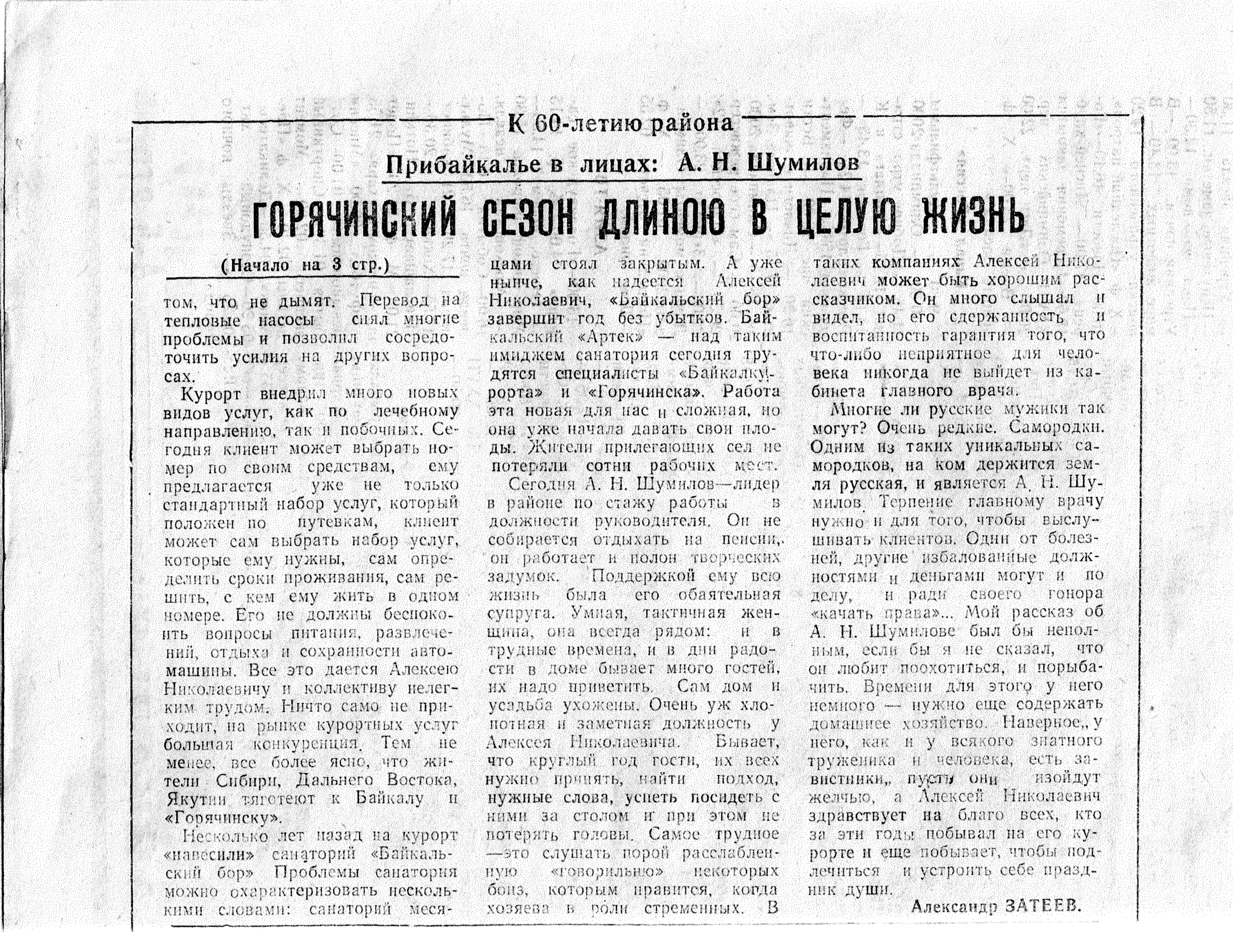 Несколько лет назад на курорт «навесили» санаторий «Байкальский бор». Проблемы санатория можно охарактеризовать несколькими словами: санаторий месяцами стоял закрытым. А уже нынче, как надеется Алексей Николаевич, «Байкальский бор» завершит год без убытков. Байкальский «Артек» — над таким имиджем санатория сегодня трудятся специалисты «Байкалкурорта» и «Горячинска». Работа эта новая для нас и сложная, но она уже начала давать свои плоды. Жители прилегающих сёл не потеряли сотни рабочих мест.